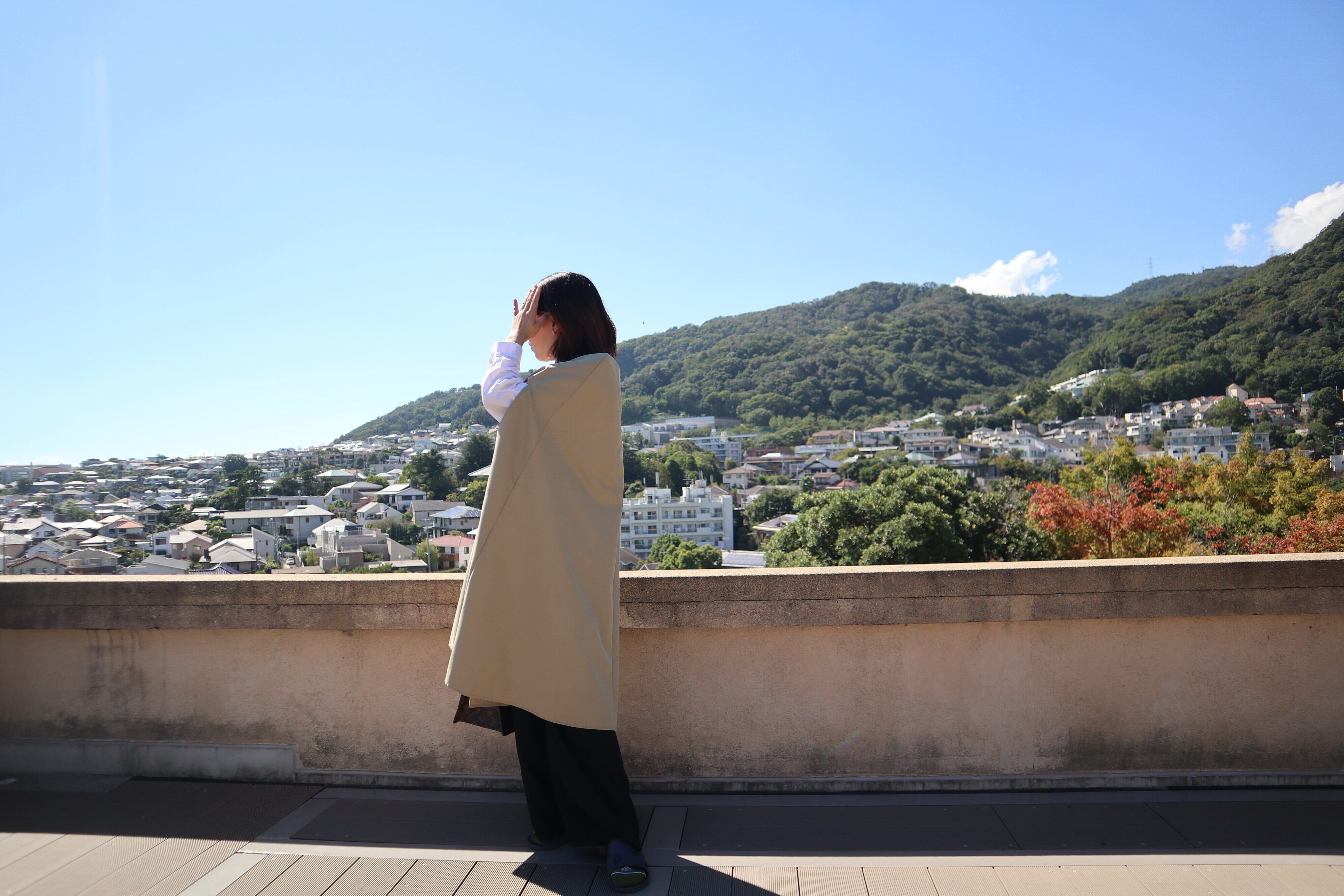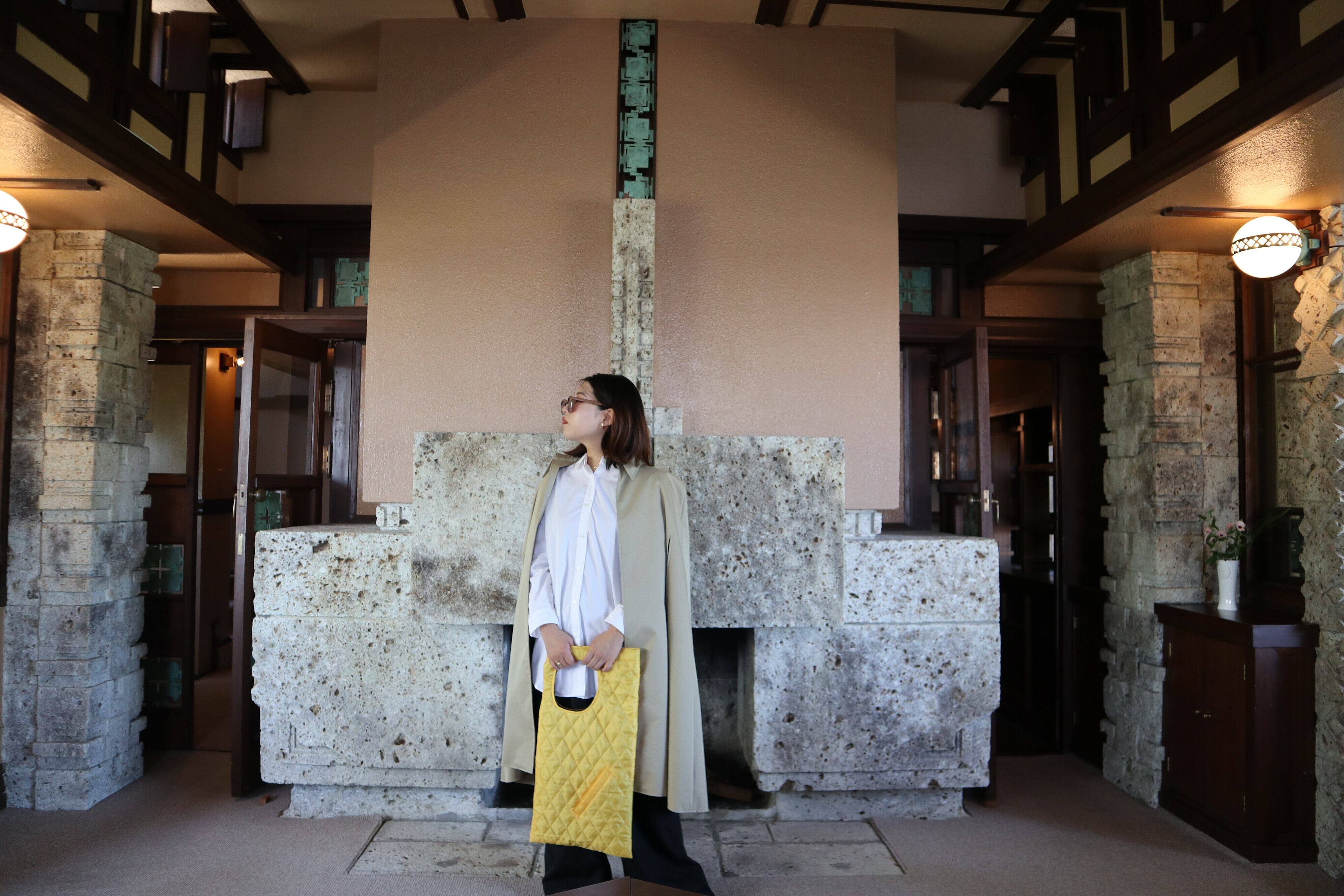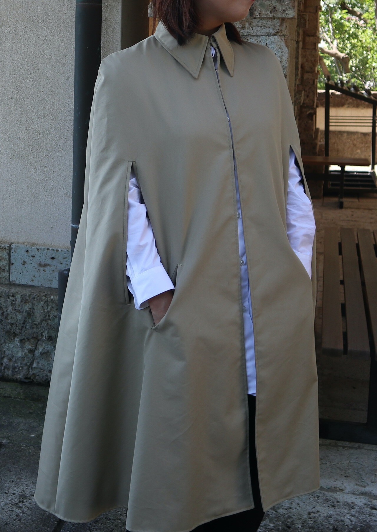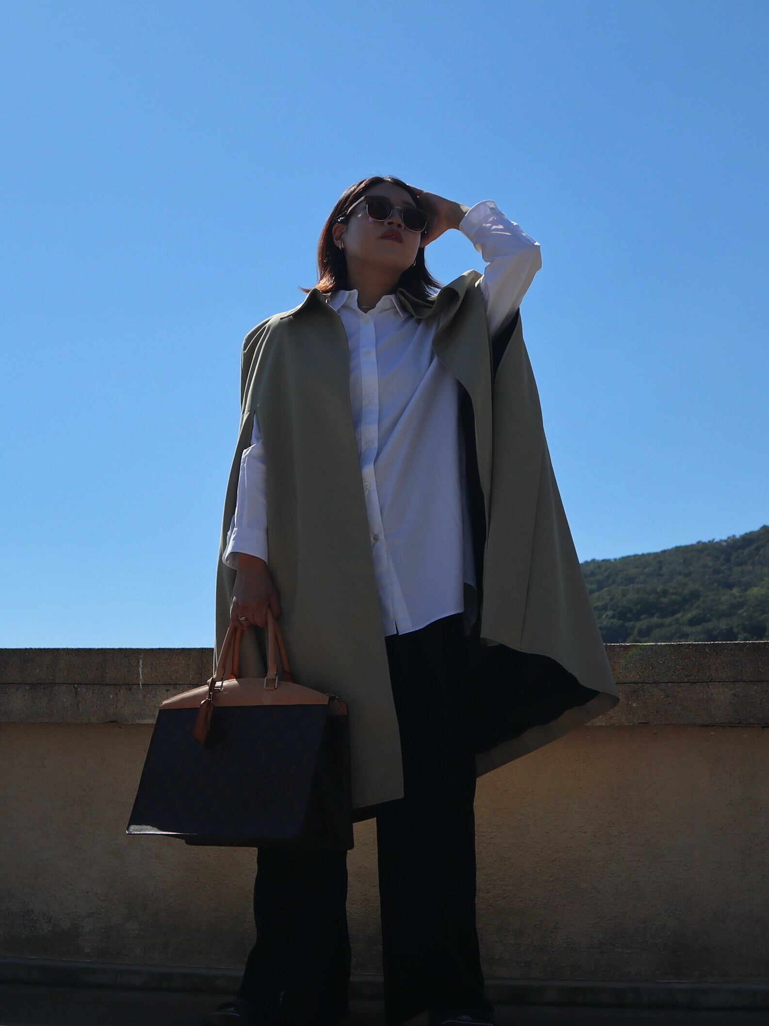 肩から掛けてマント風。ベルトバッグと組み合わせてモードに。