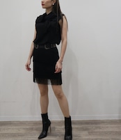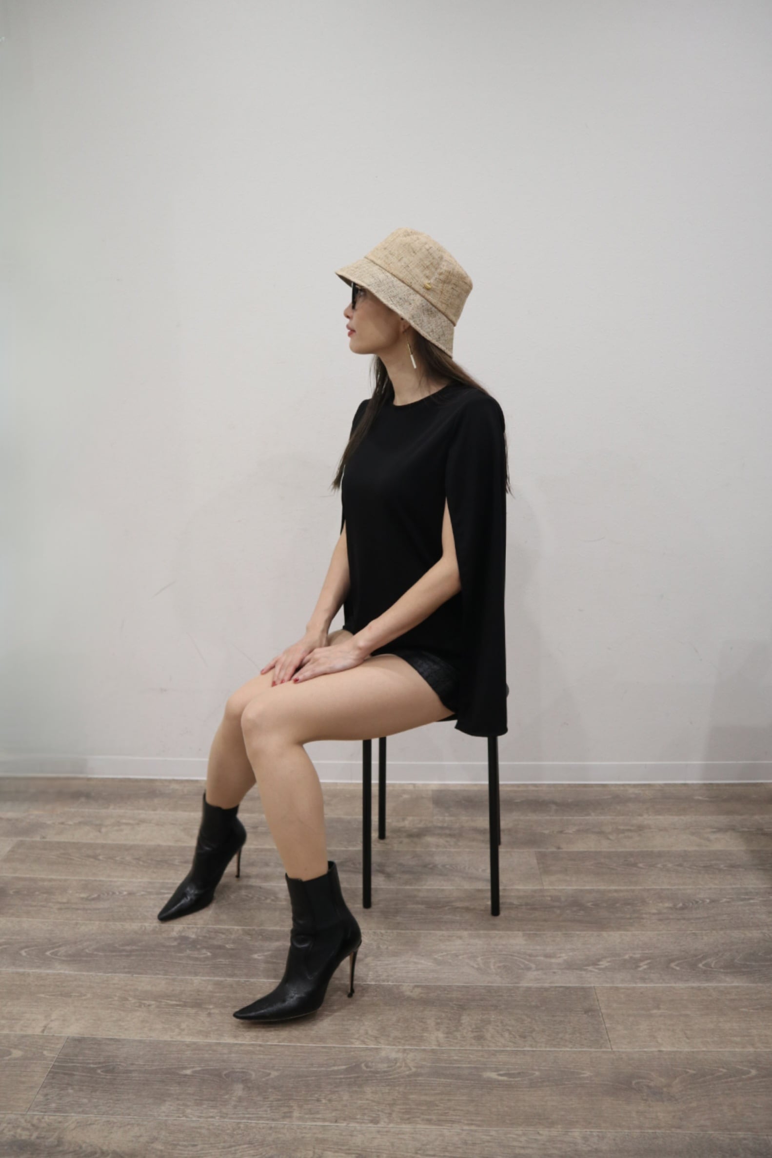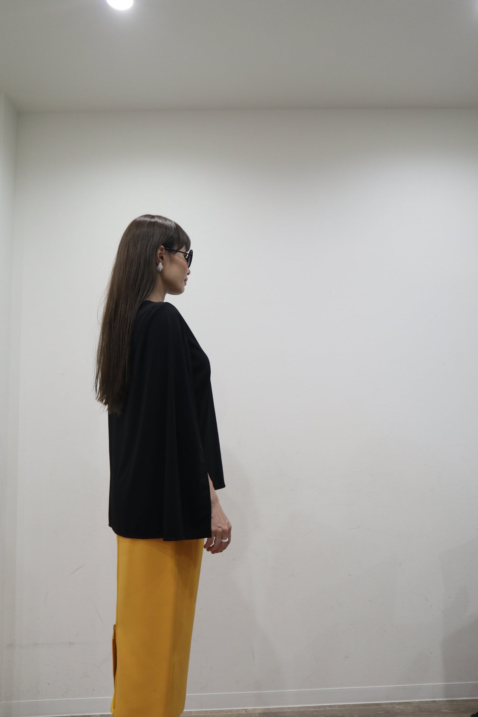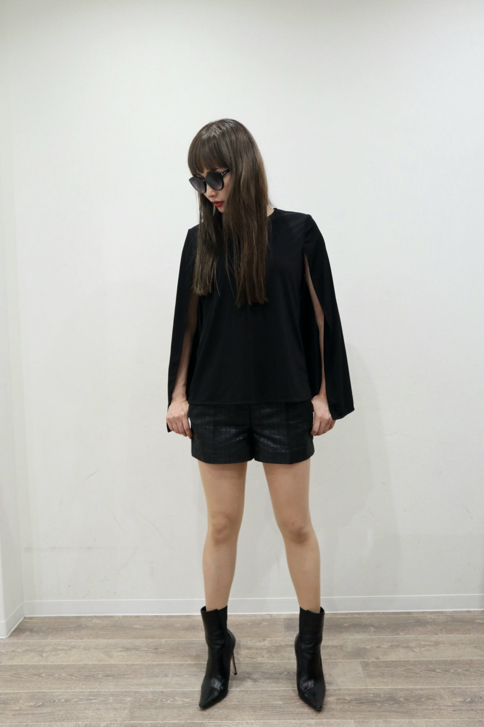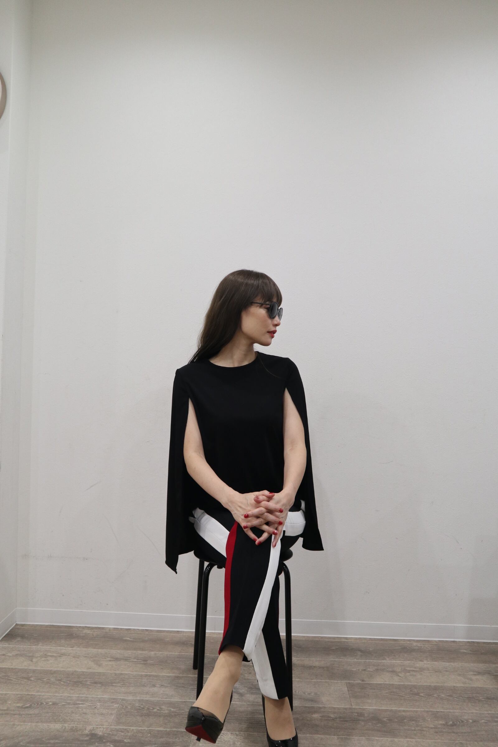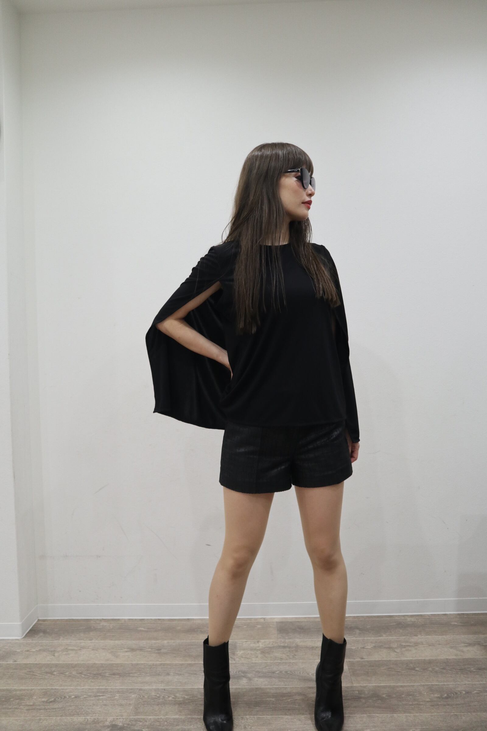 1枚だけで肩からケープを羽織っているように見える変形トップスです。